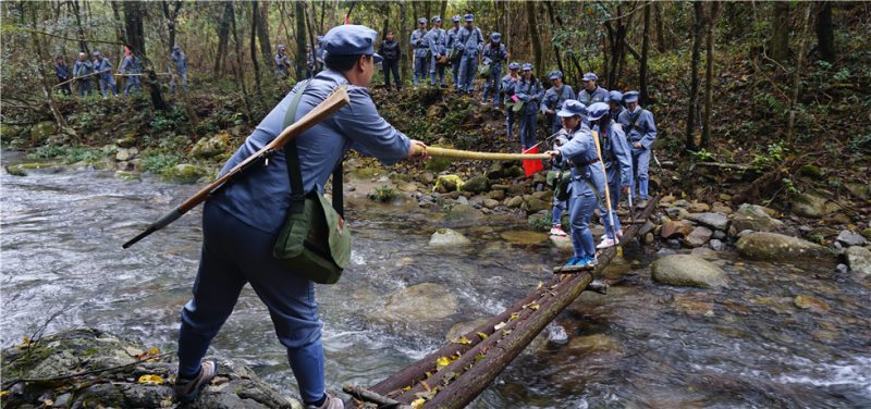 急行军路上,中核集团的基层团干部们遇到一条拦路河,大家齐心协力、互帮互助共度难关。