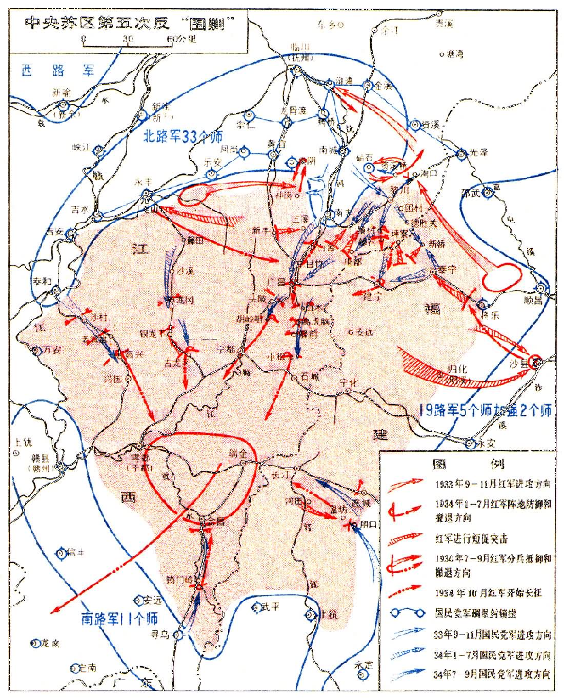 蒋介石派对革命根据地的第四次“围剿”失败后,加紧进行更大规模的第五次“围剿”的准备。他吸取前几次“围剿”失败的教训,强调这次要实行三分军事、七分政治的方针。[详细]